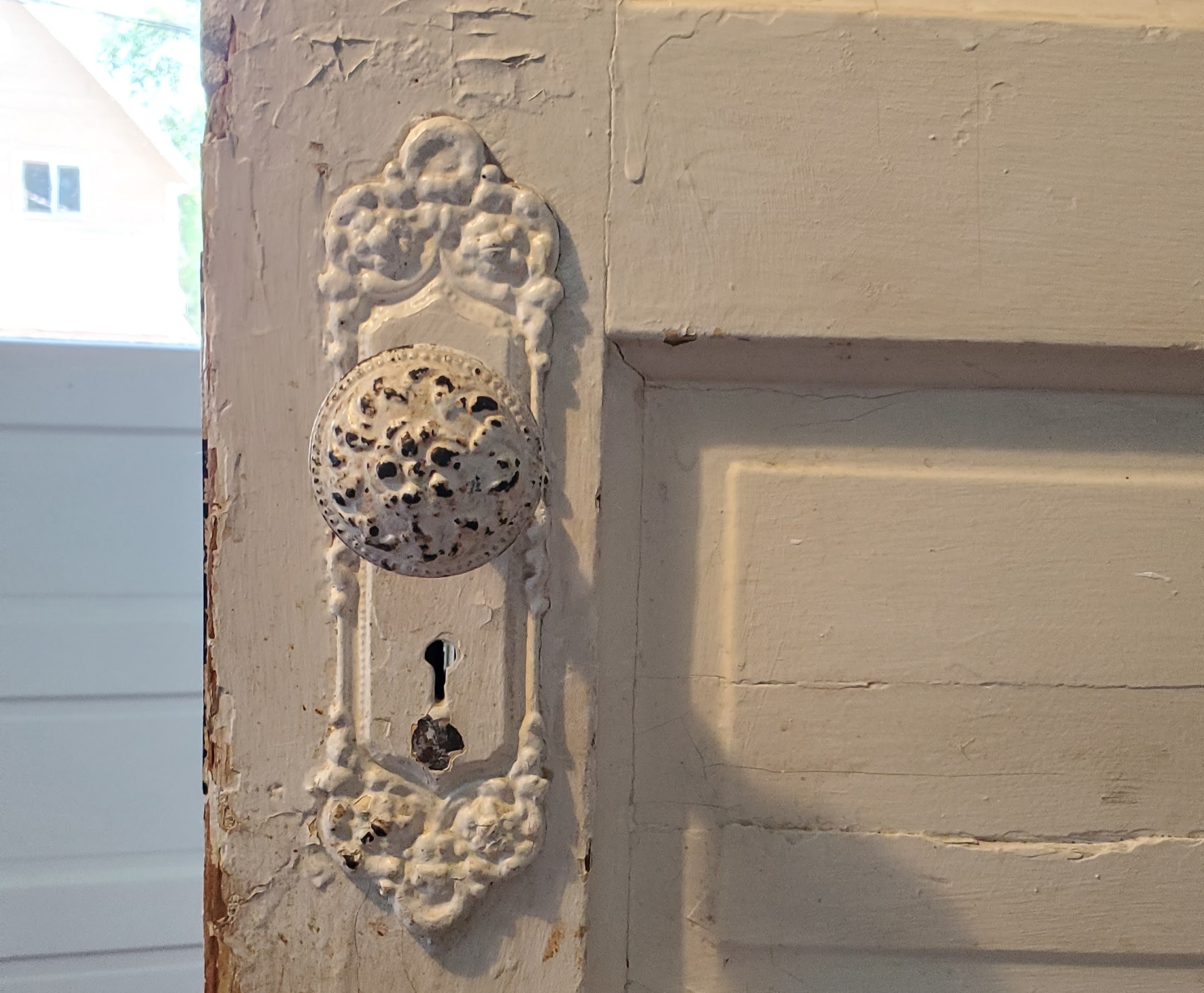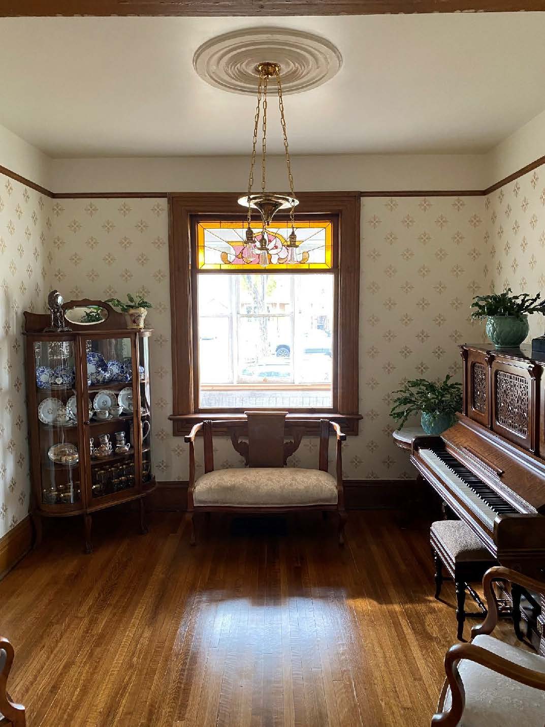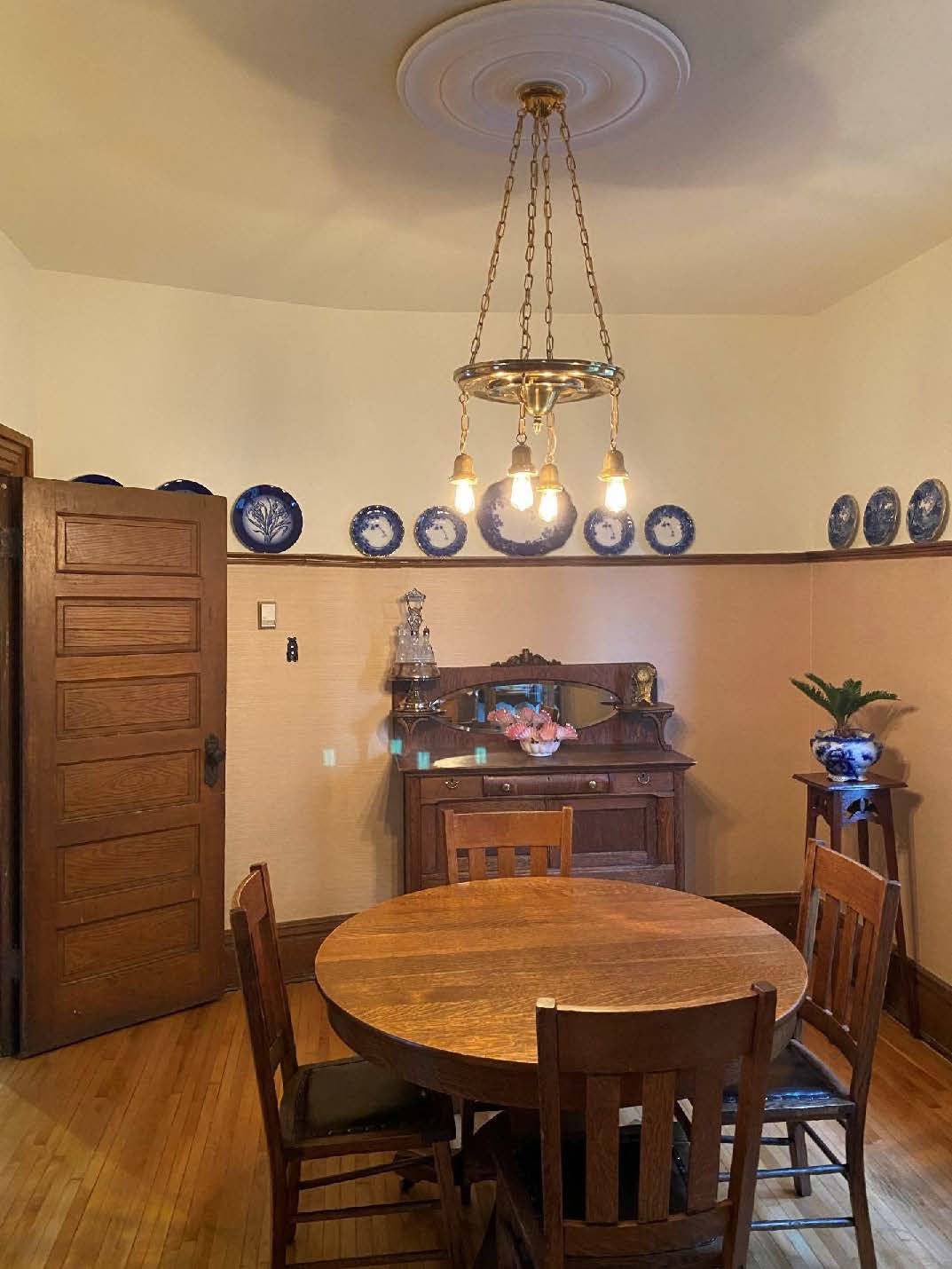 Entering the fully-restored ground floor of the house is somewhat like stepping into an old photograph. The staircase on the right is accompanied by its original bannister and spandrel (the small room below the stairs). The wall on the left holds Jacobi’s 2024 Annual Preservation Award from Heritage Winnipeg. A doorway leads to the front parlour, meant for entertaining guests, and many of the rooms on the first floor have built-in cabinets, used for books and china. Beyond the front parlour is the back parlour, meant for more casual visits. The dining room sits at the end of the hall, with large windows and its original plate rail. A doorway leads to the kitchen, with its original servants staircase and a large pantry where the maid would have eaten dinner.