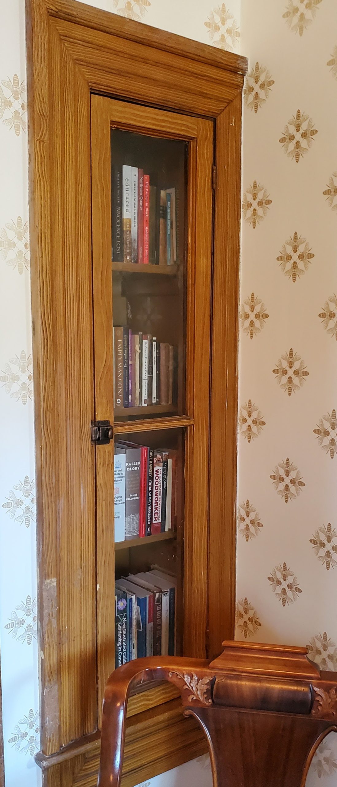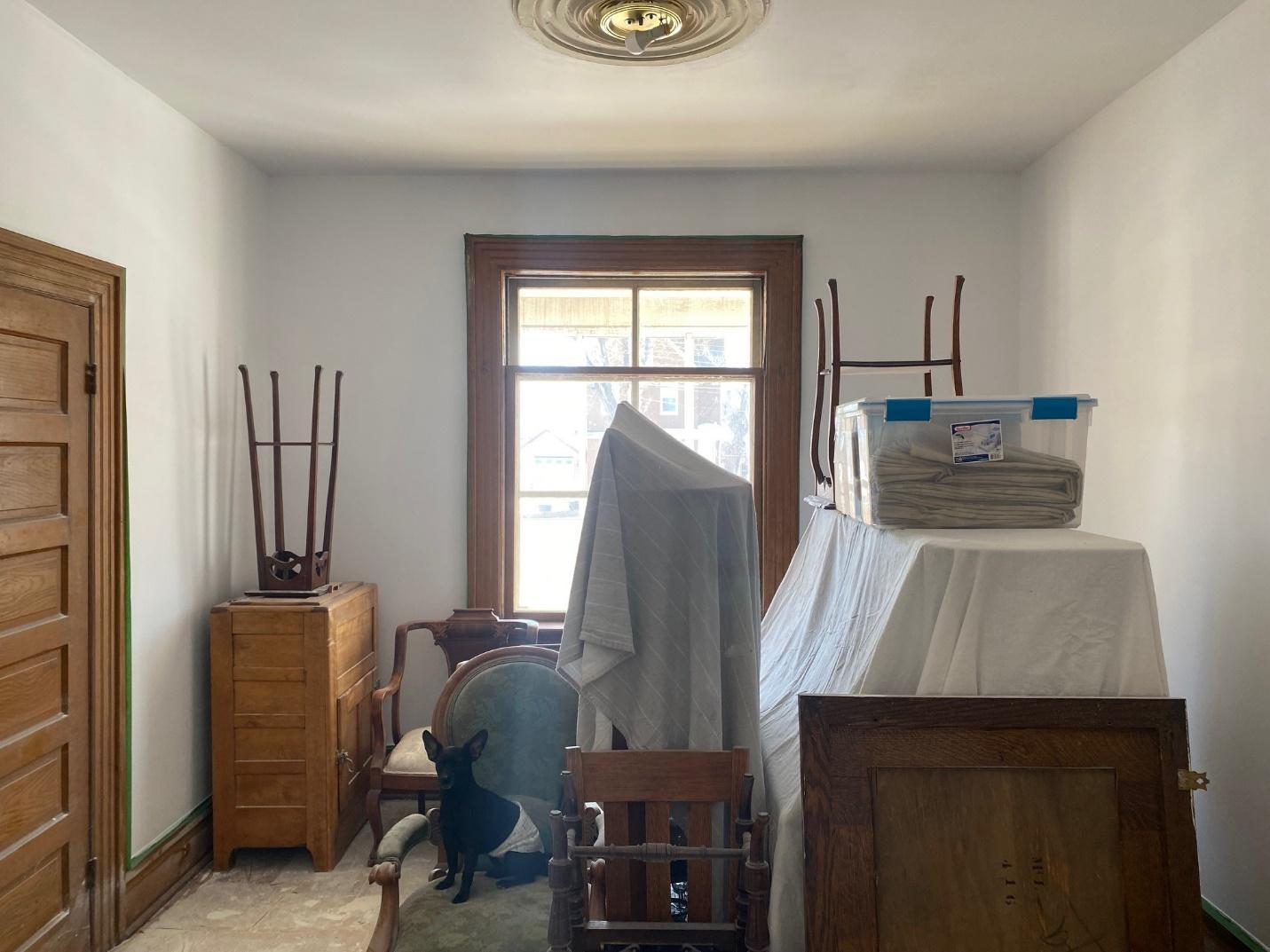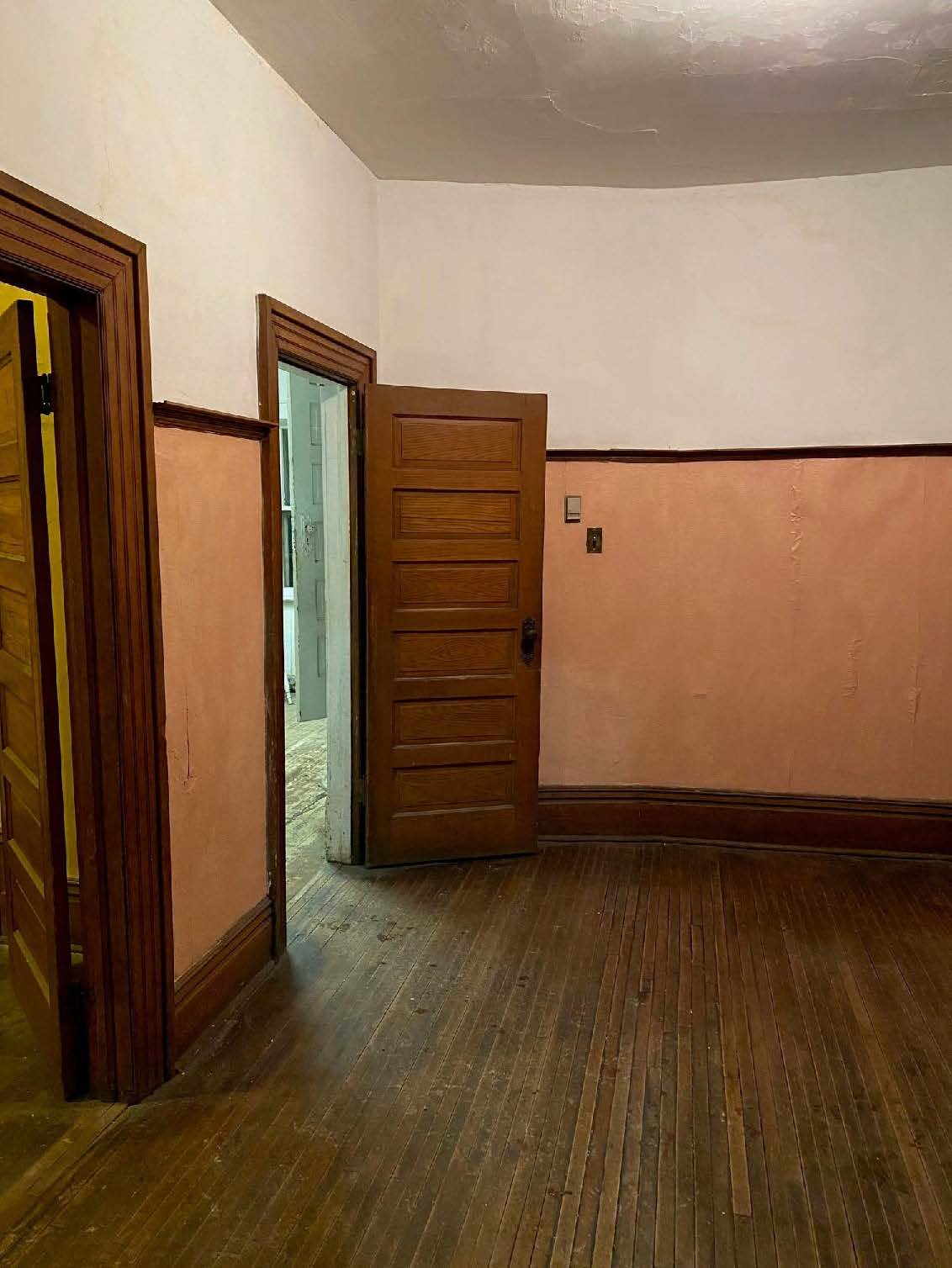 Entering the fully-restored ground floor of the house is somewhat like stepping into an old photograph. The staircase on the right is accompanied by its original bannister and spandrel (the small room below the stairs). The wall on the left holds Jacobi’s 2024 Annual Preservation Award from Heritage Winnipeg. A doorway leads to the front parlour, meant for entertaining guests, and many of the rooms on the first floor have built-in cabinets, used for books and china. Beyond the front parlour is the back parlour, meant for more casual visits. The dining room sits at the end of the hall, with large windows and its original plate rail. A doorway leads to the kitchen, with its original servants staircase and a large pantry where the maid would have eaten dinner.