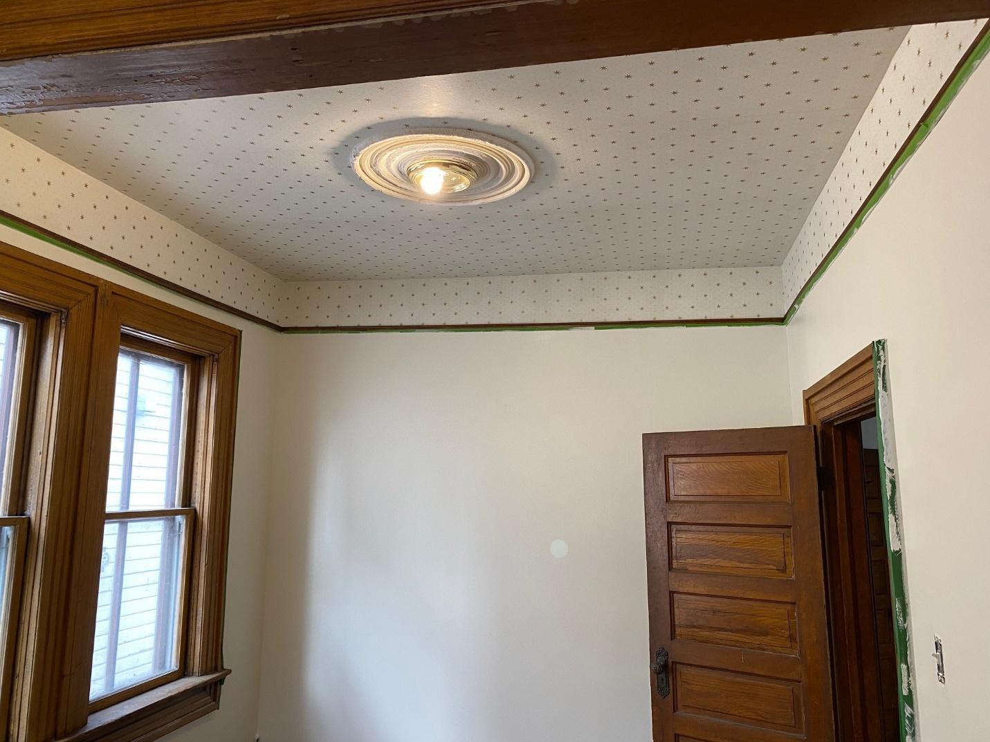 Reproduction of historically accurate ceiling paper at 153 Burrows Avenue. Heritage Winnipeg.