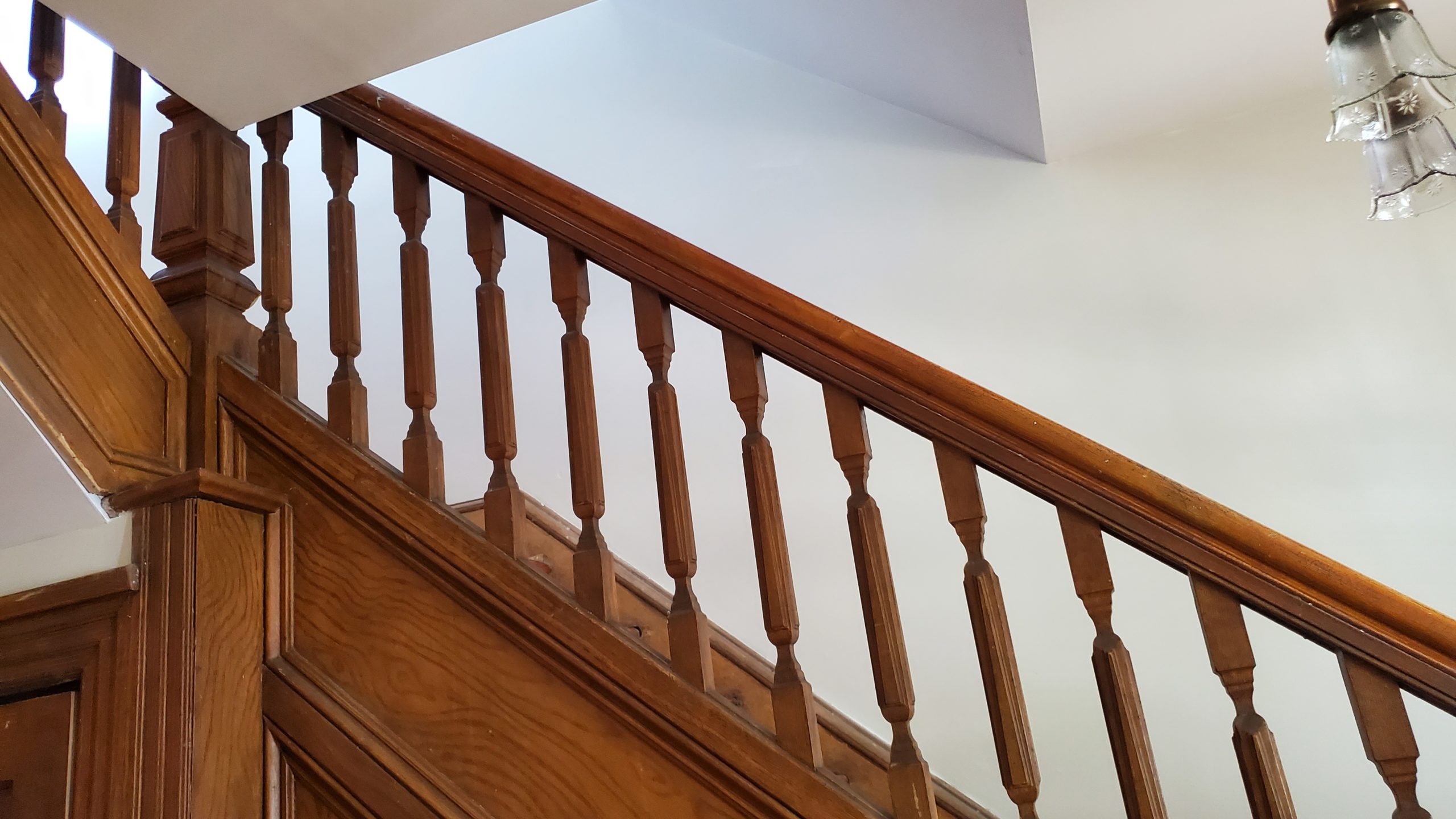 The maid’s staircase in 153 Burrows Avenue. The staircase leads from the kitchen to the second floor. It is narrow and curved with no handrail, a typical design for servants staircases of the era as staff comfort was a low priority. Heritage Winnipeg.