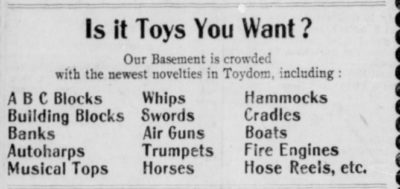 And of course, we shouldn’t forget the little ones. During the holiday season, the Imperial Dry Goods store claimed to be the Santa Claus headquarters for toys and dolls. Inside the Imperial’s toy department, you could find gifts for just about any child. For the adventurous, there were skates and sleds and footballs. For the quieter child, board games like crokinole worked instead. Initially, the toy department was located in the building’s basement but by 1904 it had made the move up to the third floor.