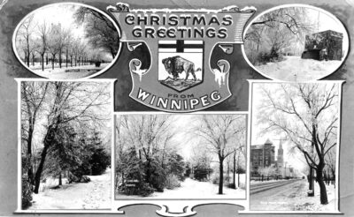 Christmas Greetings From Winnipeg! An undated wintry view of Broadway, the Upper Fort Garry Gate, St. John’s Park (two images), and River Avenue.