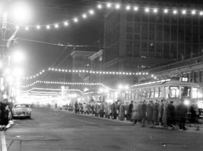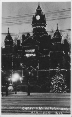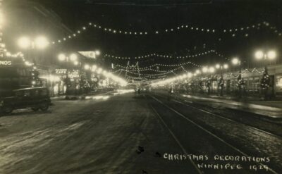 It was not just the retail stores that took part in Christmas decorations in Winnipeg. In 1929 the Beautify Winnipeg committee convinced business owners to support them in decorating the city’s streets. Christmas trees were attached to lamp posts and lights strung over traffic, with the Manitoba Electrical Association covering the cost of lights. What a festive sight it must have been, strolling beneath the twinkling lights of Main Street and Portage Avenue on a snowy winter’s night! Portage Avenue’s decorations shone so bright they eventually became known as the “Mile of Lights”. Unfortunately, lack of interest, cost and a drought causing electricity shortages, all caused the cancellation of the decorations on and off throughout the years. But as of 2020 the tradition persists, with the current holiday decorations along the historic Portage Avenue and Main Street having lit up the season’s nights since 1999.