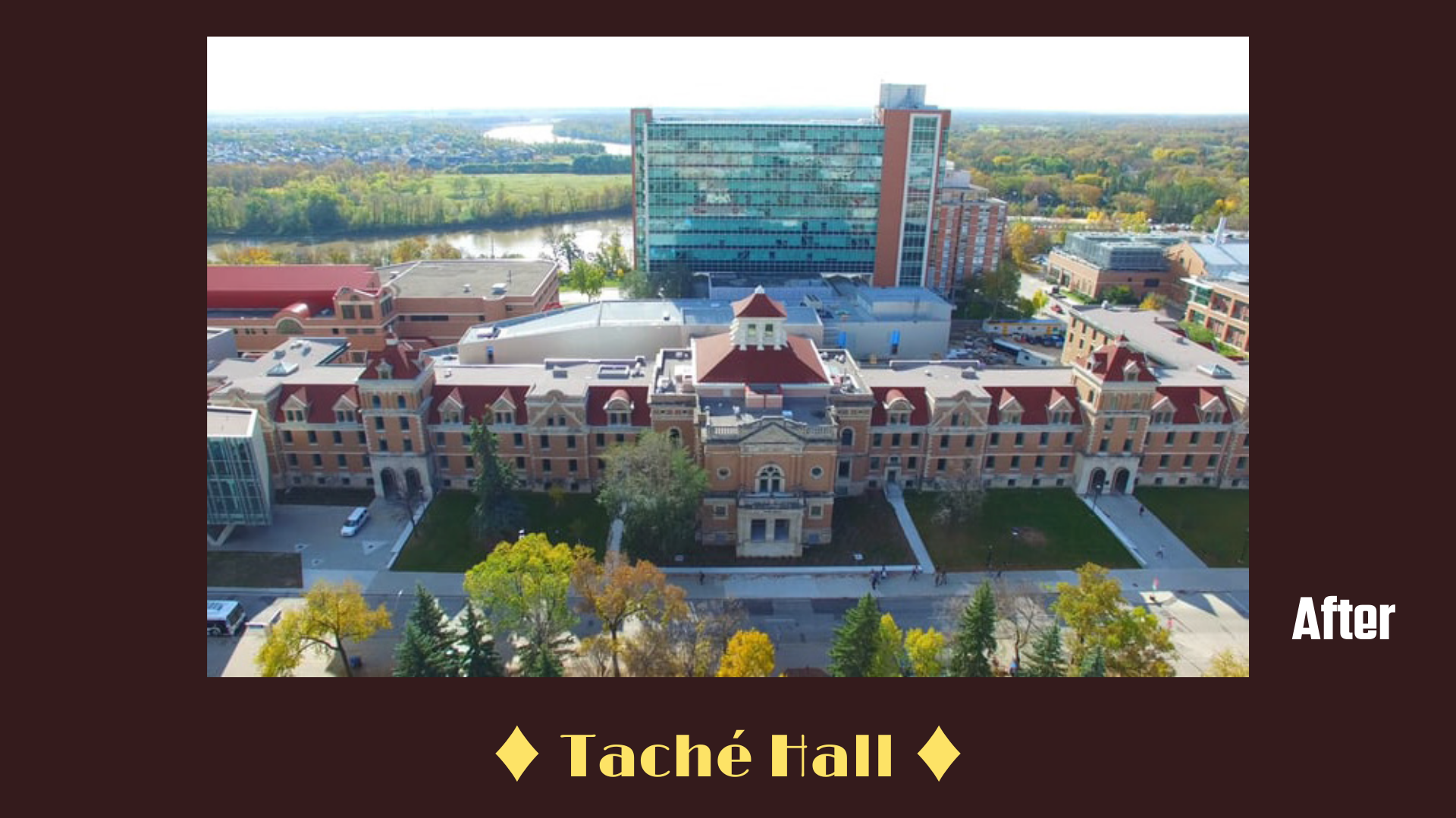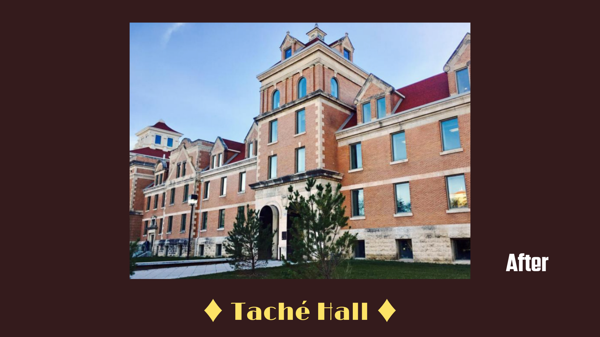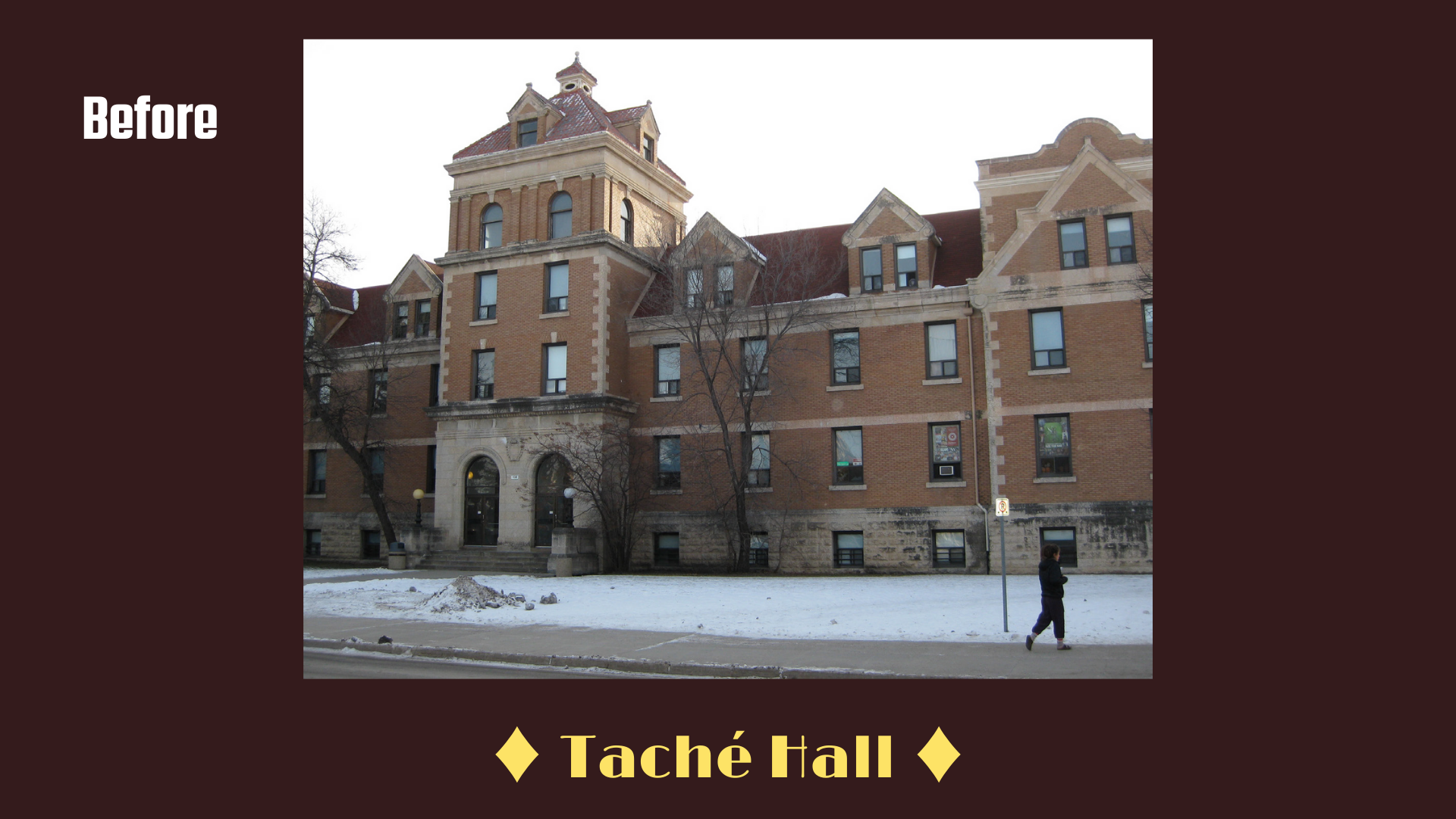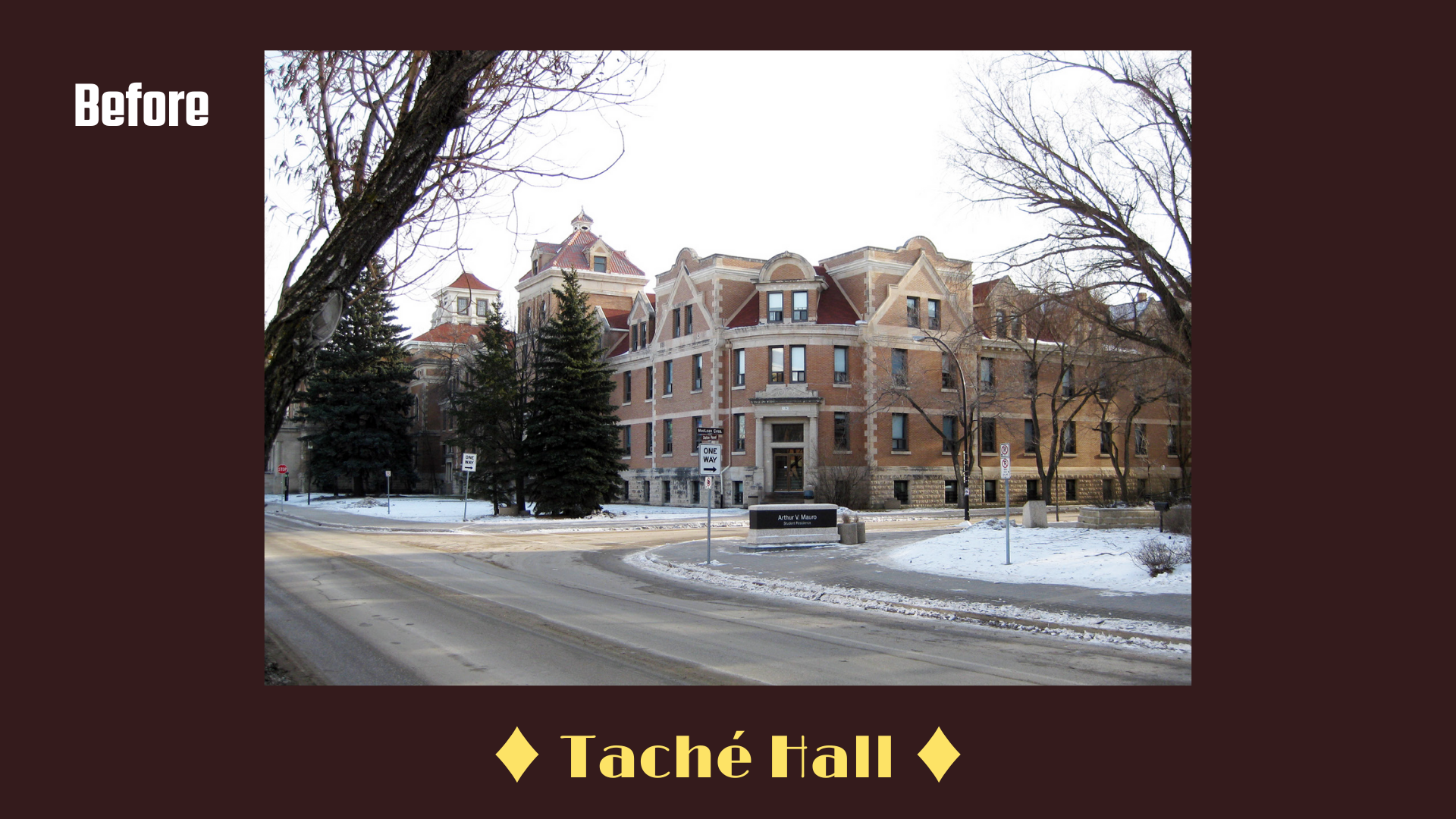 buildings and operated as a student residence, initially designed for the Manitoba Agricultural College. The Georgian-style building became a well-loved fixture, housing University students until 2008. Beginning in 2013, Taché Hall underwent major renovations, becoming a new academic space for the Faculty of Music, the School of Art, and the theatre program. The redevelopment made use of the original residential layout, repurposing the space for its new life.