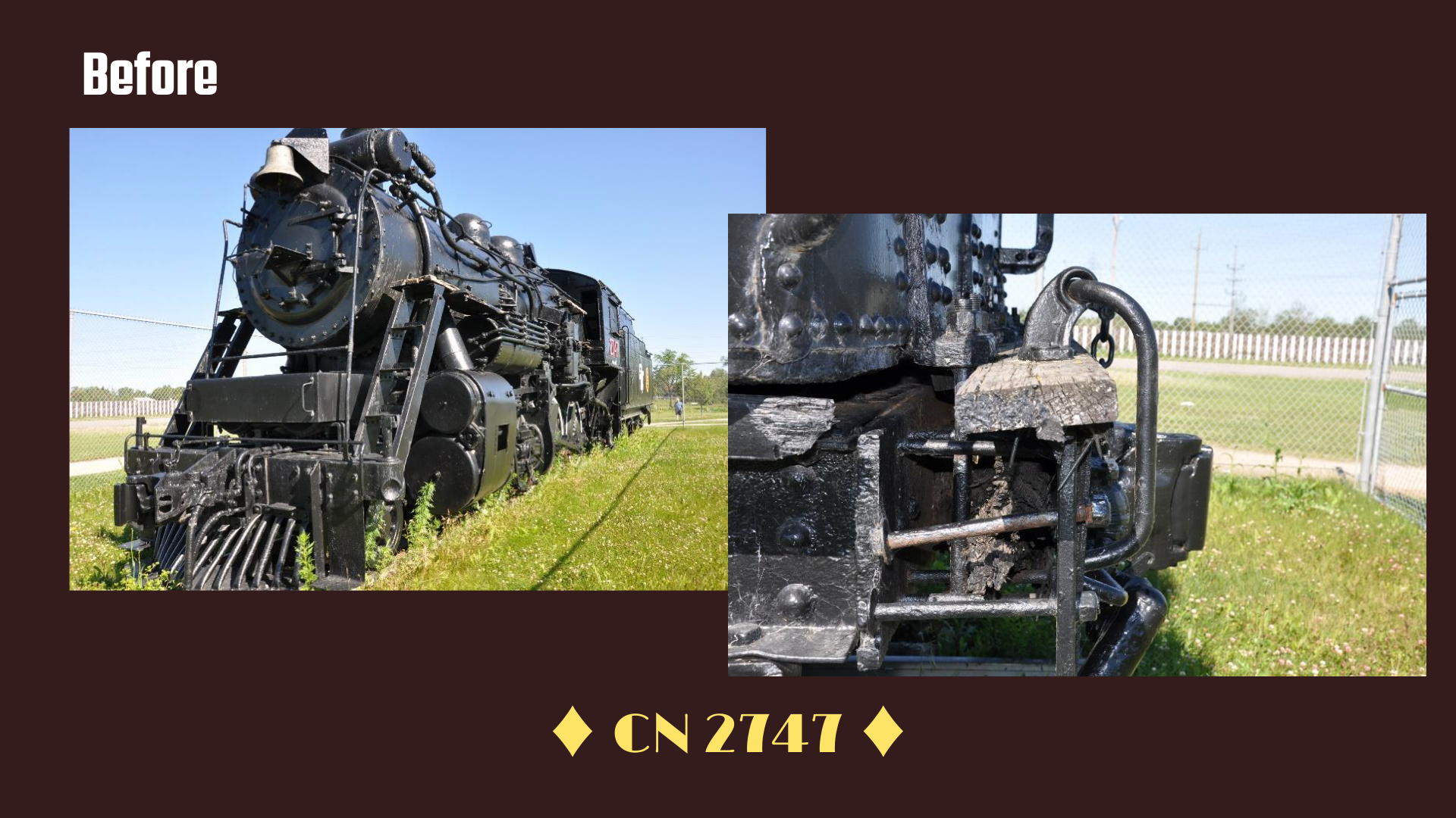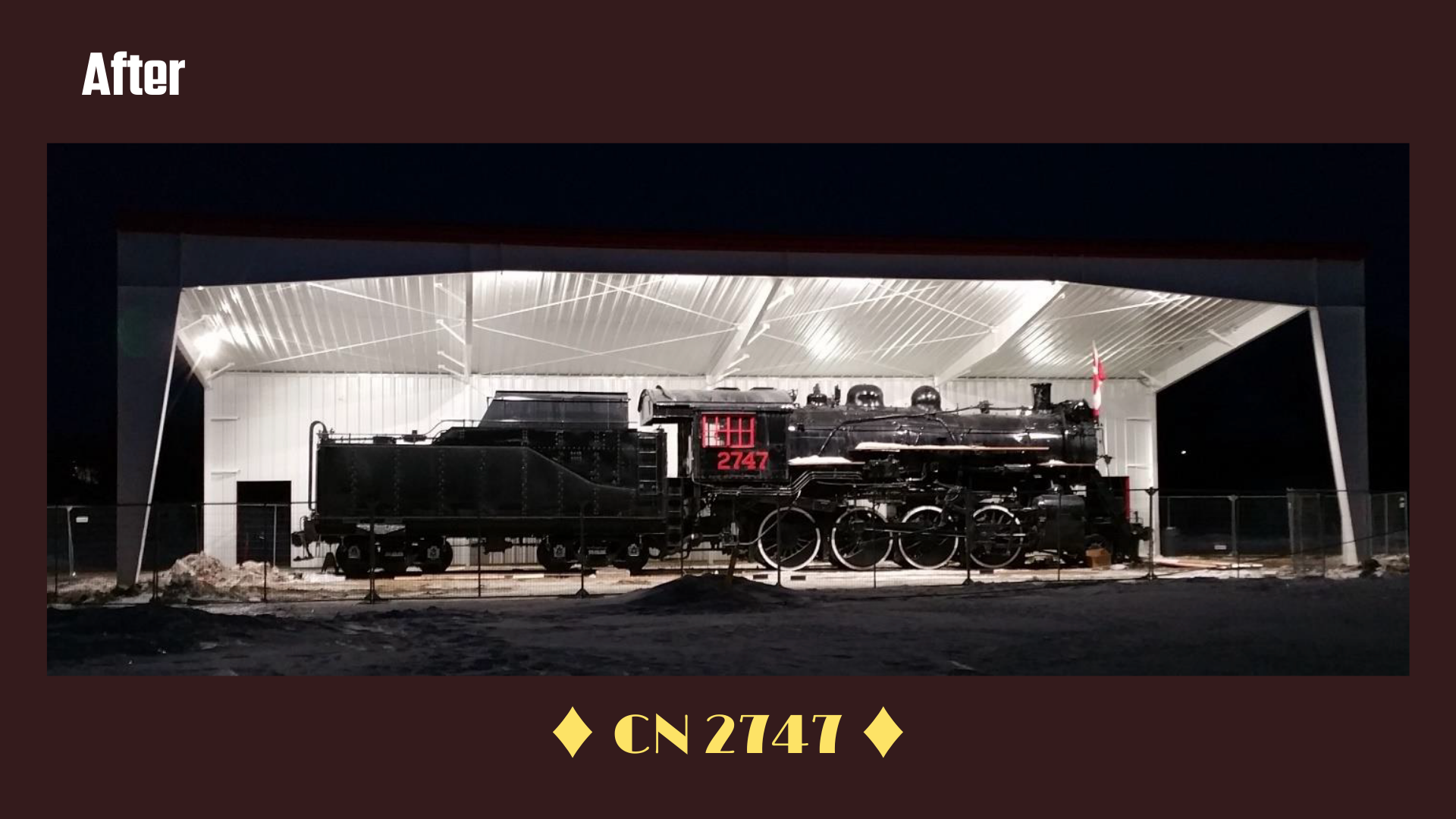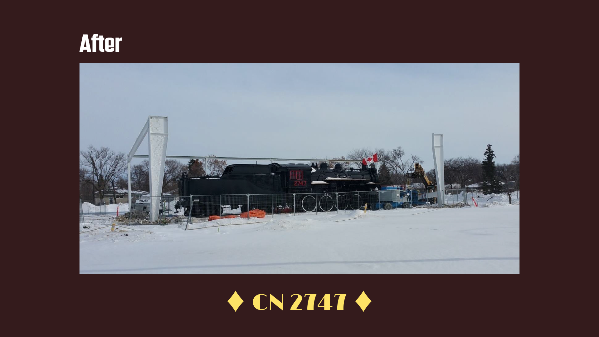 As the first steam locomotive built in Western Canada by the Canadian National Railway, this 1926 train holds great historical significance. The engine worked in both Alberta and Manitoba until its retirement in 1960, when it was saved from becoming scrap and was given a home in Kiwanis Park (now Rotary Heritage Park). When it was acquired by the Transcona Museum in 2015, the train was in rough condition, plagued by vandalism, theft, and deterioration. Volunteers began working to preserve and repair the engine, making it possible for visitors to learn its history up close. An enclosure was designed to protect CN 2747 from damage, and the engine was officially reopened in July of 2024.