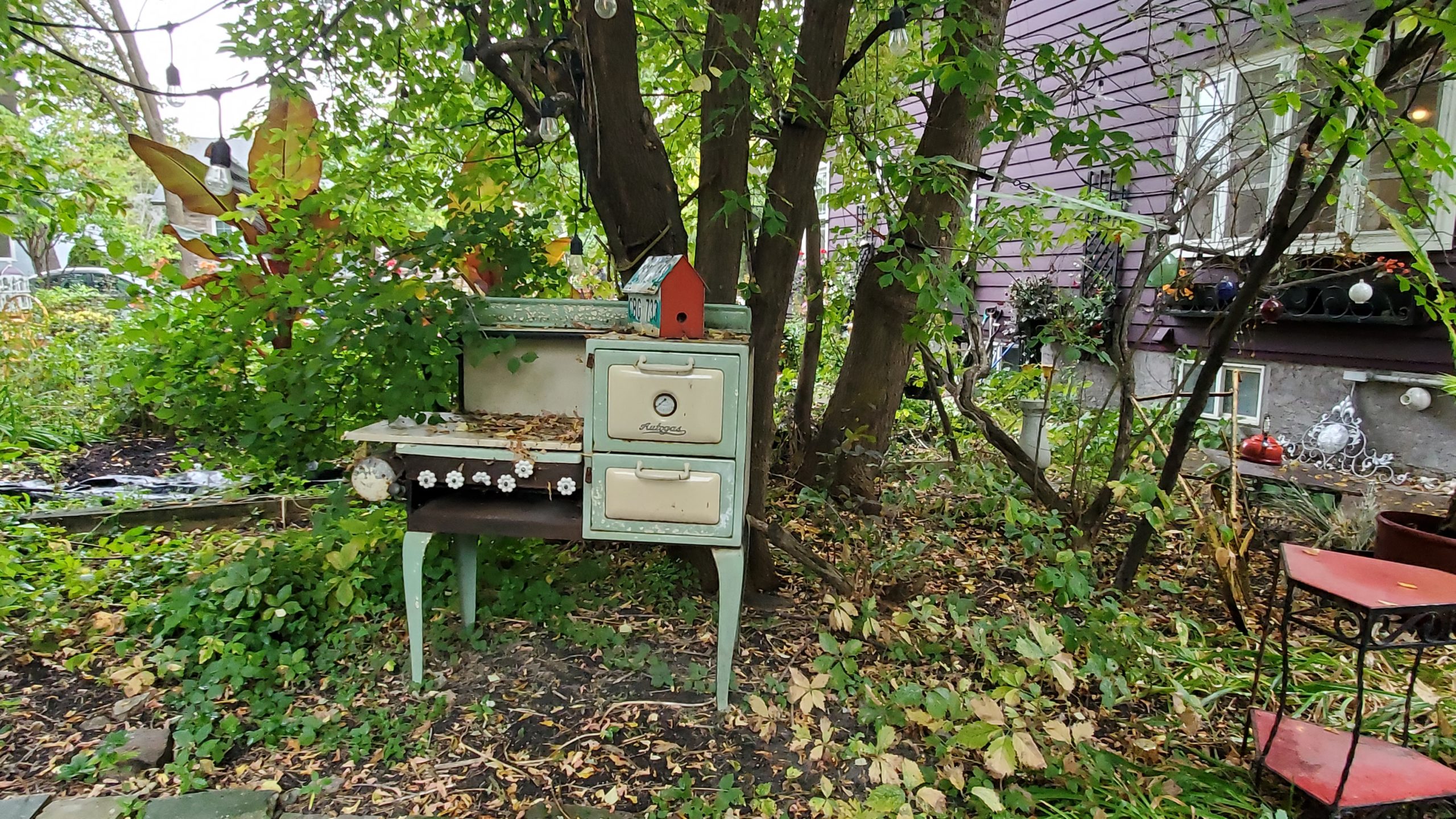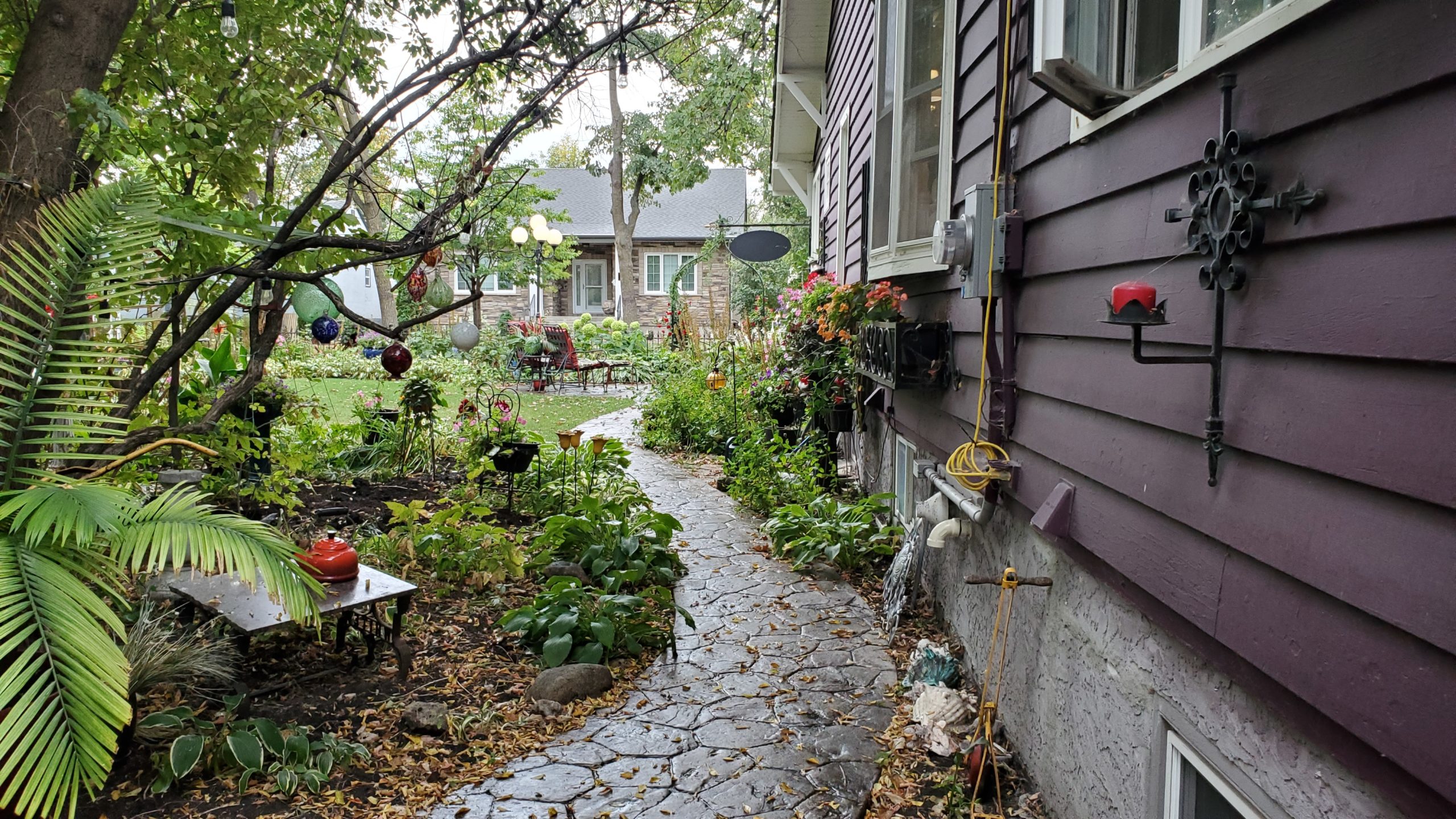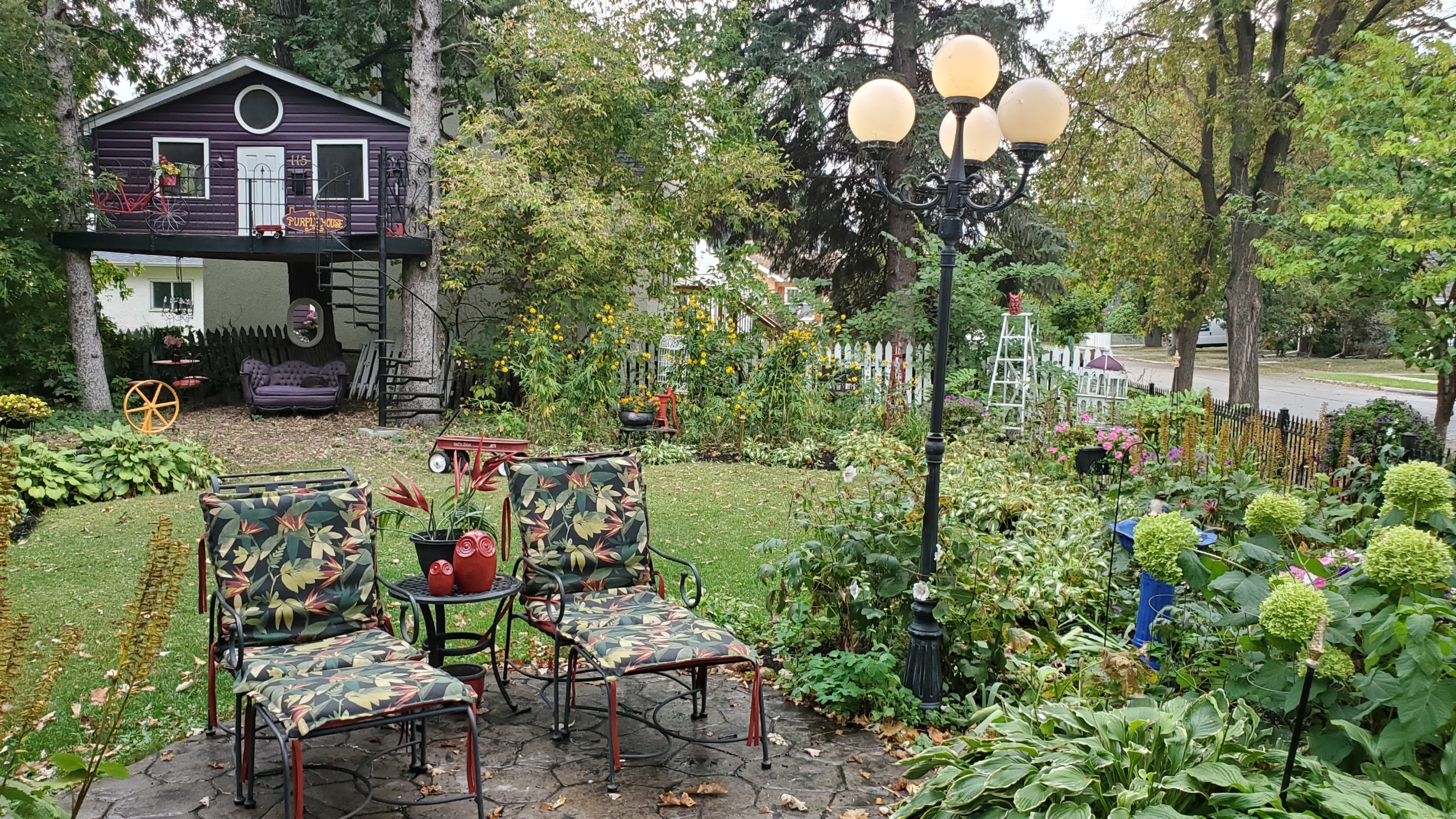 “I had a garden in my old home, and so when I saw this place, it’s a huge playground. Because it was left unattended, I had to start from scratch. I just built it up, I brought some of my cuttings from my old place and transplanted a lot of things and just gathered things from the neighbourhood. Within the first two years, we fixed the foundation, did the sidewalk, painted the house purple, and I threw in a garden, and that was solely my thing. I had a whole lot more sun then, so the garden flourished very quickly and now the trees have really grown and changed that dynamic. It was like, once I had that put in and painted the house purple, people would be walking by and going “We didn’t know this house existed”, because it was all kind of overgrown, and it was just another house along the strip. I think within my second year here, someone had entered me in the Take Pride Winnipeg contest and I won first place, and I’m like, ‘Oh, I didn’t even try!’ ”