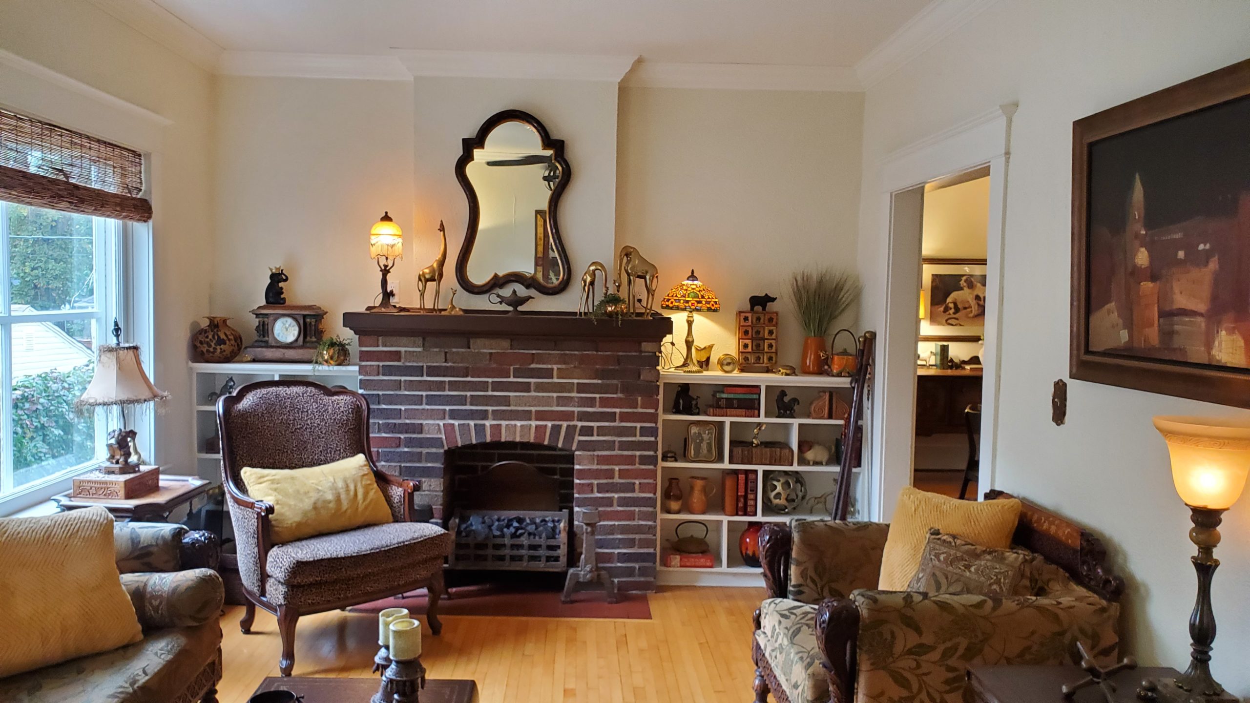 Goetz’ living room at 115 Linden Avnue. The electric brick fireplace at the end of the room is original to the 1921 home. Heritage Winnipeg.