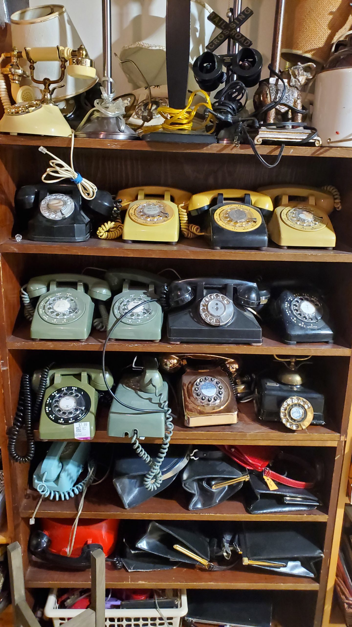 A bookshelf filled with rotary telephones, one of many things Goetz collects. Heritage Winnipeg.