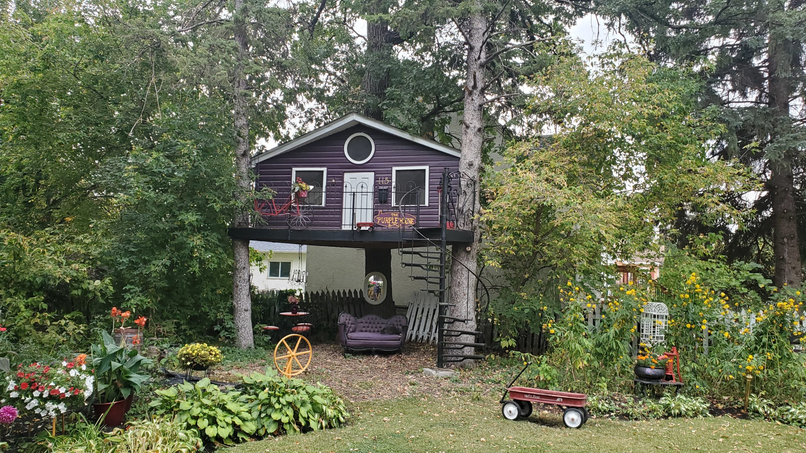 The front garden at 115 Linden Avenue, with the matching purple treehouse in the background. Heritage Winnipeg.